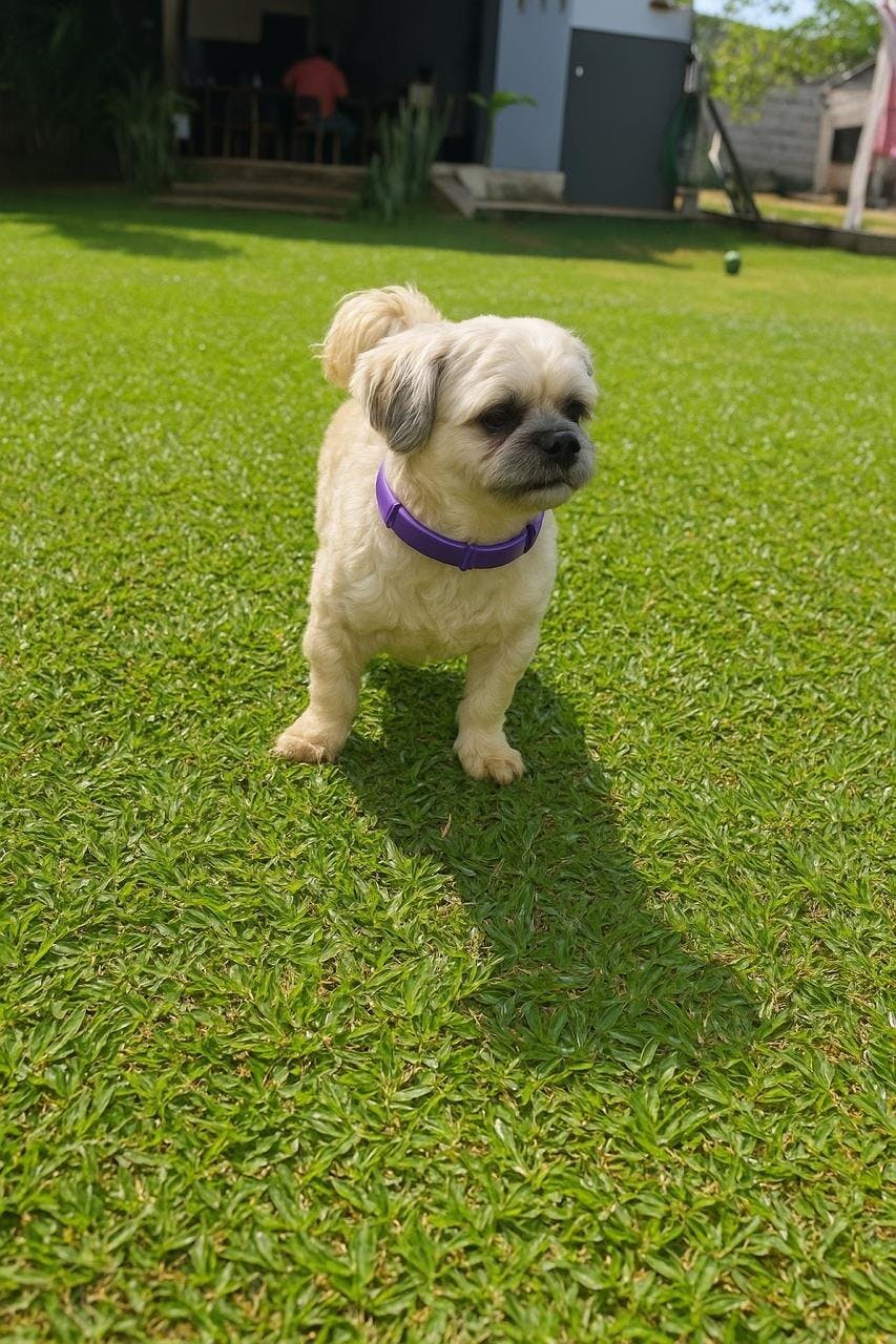 Tedy era muito medroso, com chuva, com outros animais, íamos para o rancho e ele praticamente não saia do quarto, depois do uso da coleira calmante, ele está bem melhor, olha ele passeando sozinho na grama! Estou muito feliz!